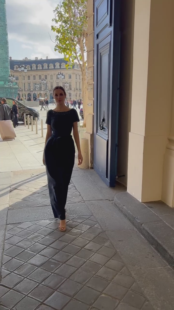 FILAGREE GLASS BEADED EMBROIDERY GOWN NAVY